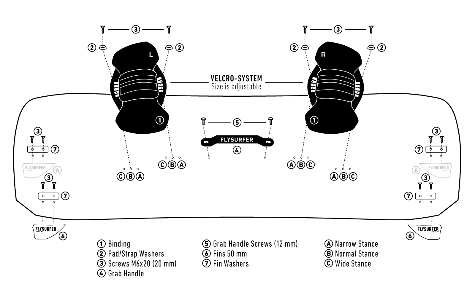 Ребра, изготовленные методом литья под давлением, изготовлены из полиамида, армированного углеродом, который отличается особой легкостью, ударопрочностью и прочностью. Форма и размер SOLID 55 мм поддерживают направление движения и характеристики против ветра, идеальное сочетание для линейки досок FLYDOOR.